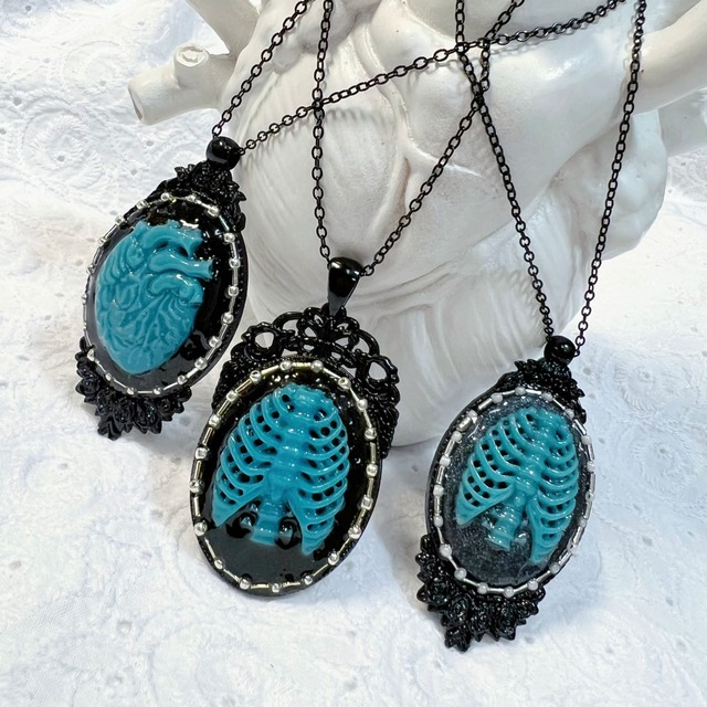 ターコイズブルーと黒のレジンでひとつずつ製作いたしました、細かな装飾が美しいカボション。ビーズで縁取り、艶のあるブラックのミール皿にセッティングいたしました。可愛らしくも存在感があり、主役になれるアクセサリーです。 ネックレスチェーンを外し、バッグチャームなどにしていただくのもおすすめです。 ⚠︎ひとつずつかたちやパーツが違います。ご確認の上お迎えください。 【A】心臓×シルバービーズ×シルバーシリンダービーズ×薔薇装飾ミール皿 【B】肋骨×ホワイトビーズ×シルバーシリンダービーズ×百合の紋章ミール皿 【C】肋骨×カボションの黒部分に偏光シルバーラメ×ホワイトビーズ×シルバーシリンダービーズ×薔薇装飾ミール皿 ●金具カラー シルバー ●素材 レジン、メッキ加工金具、ガラスビーズ ●サイズ チェーン/45センチ ネックレストップ/5センチ