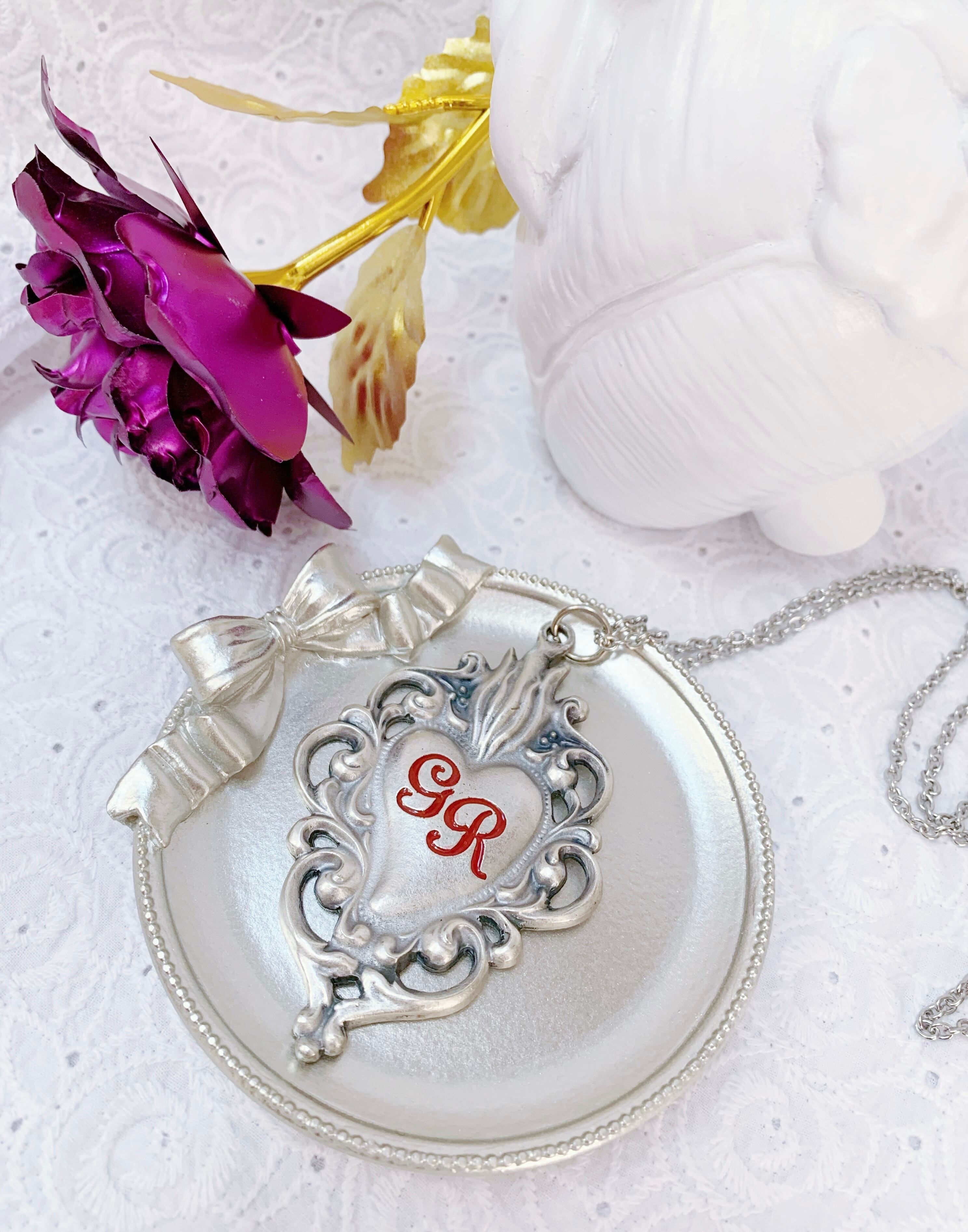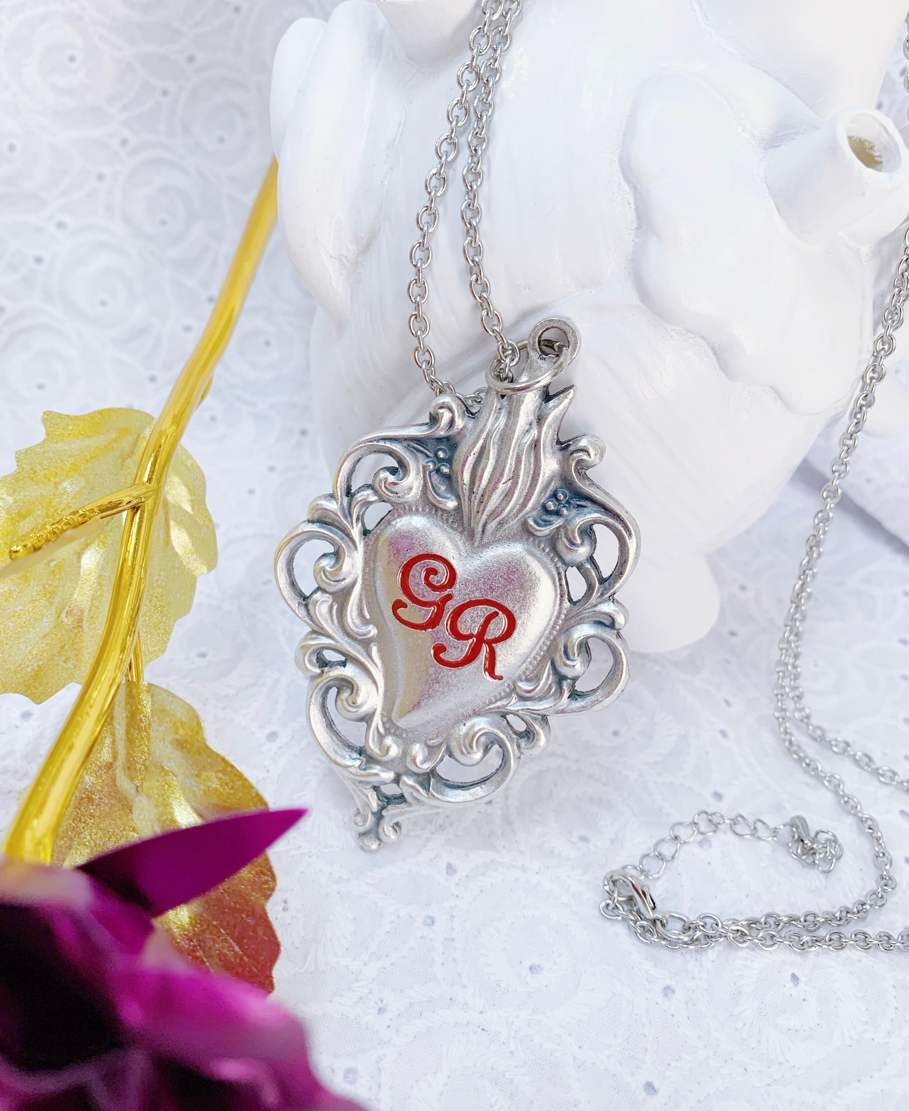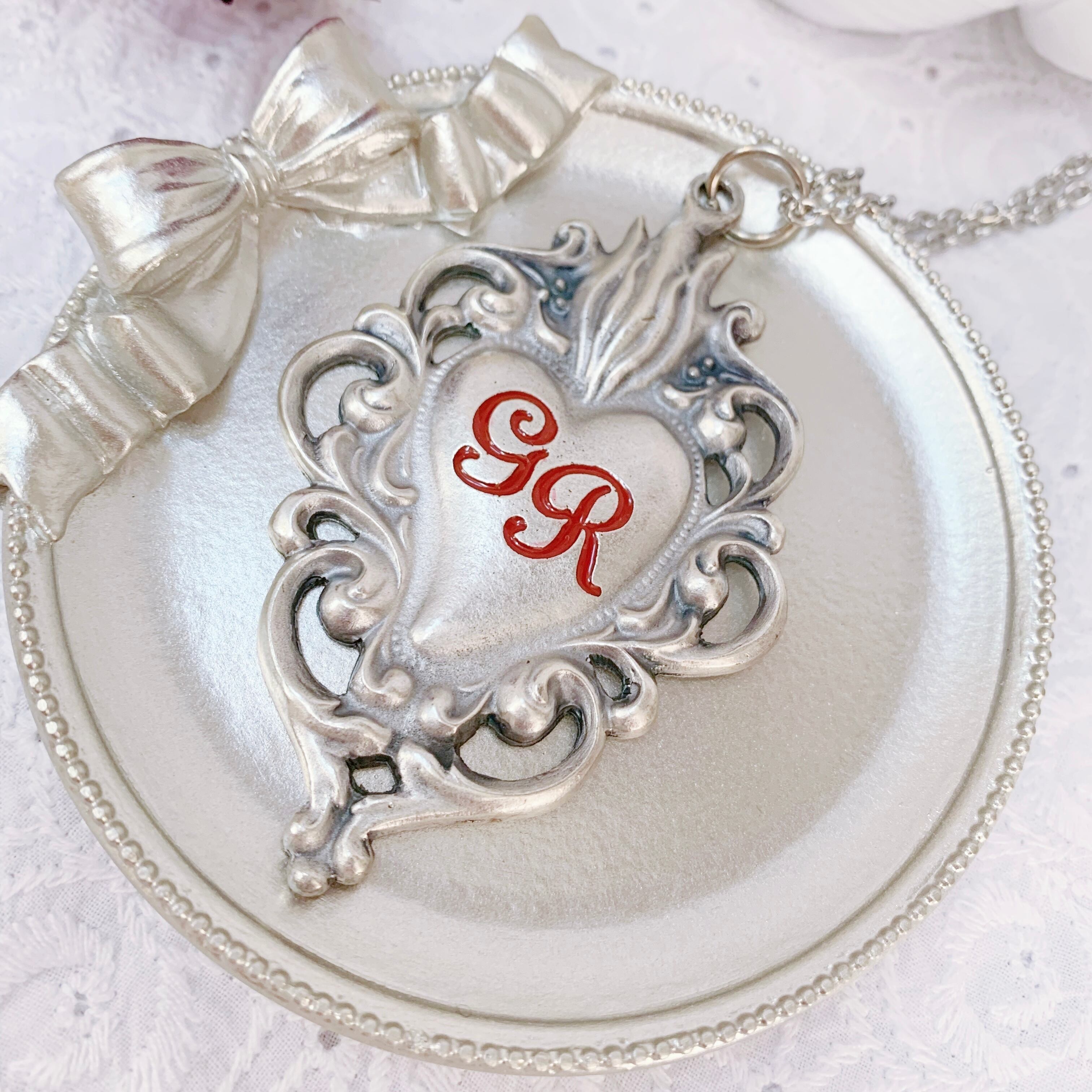 大きな御心のメダイを使用したネックレスです。存在感がありながらも、ハートとバロック調の装飾がとても可愛らしく上品。様々なスタイルに合わせていただけるデザインです。