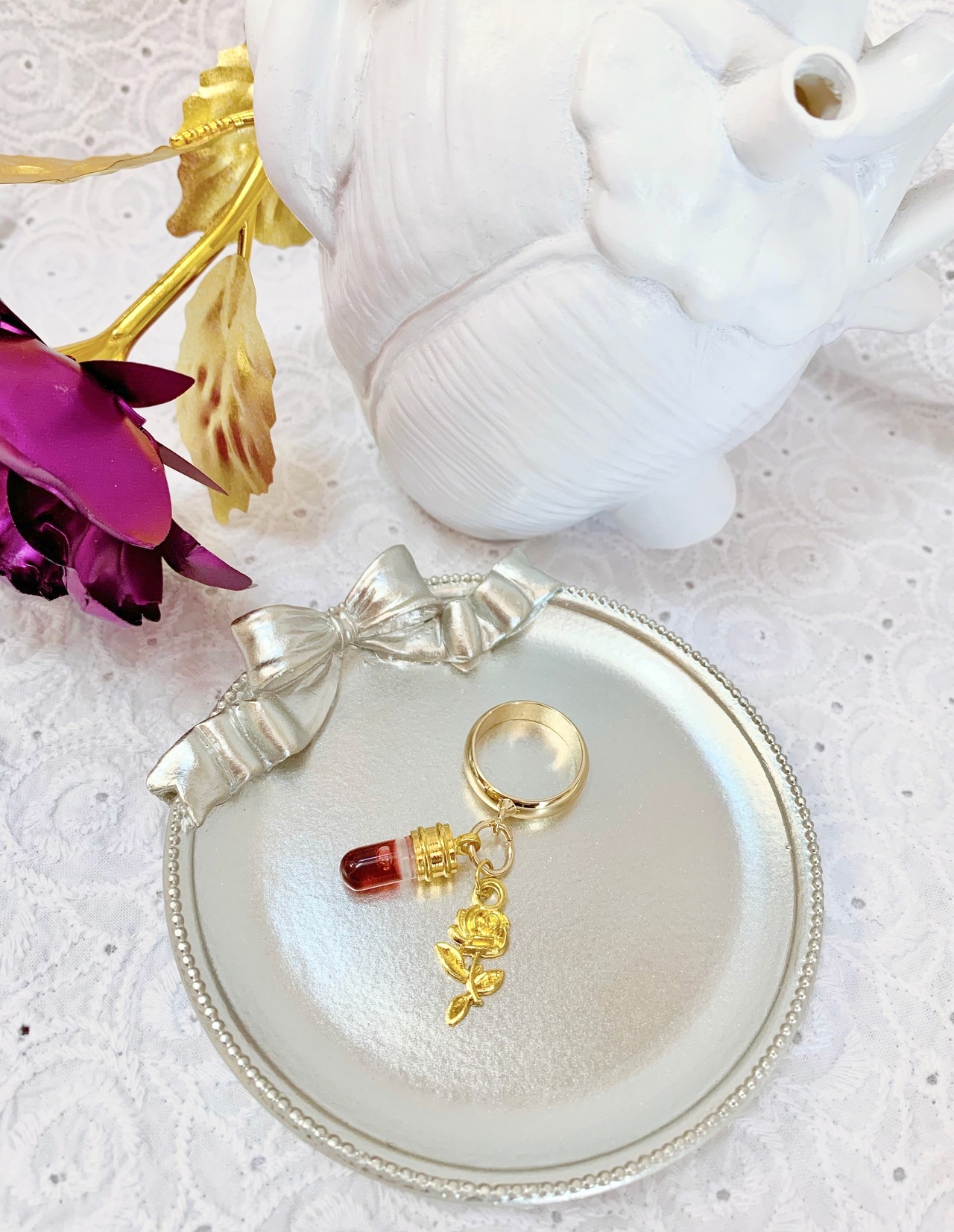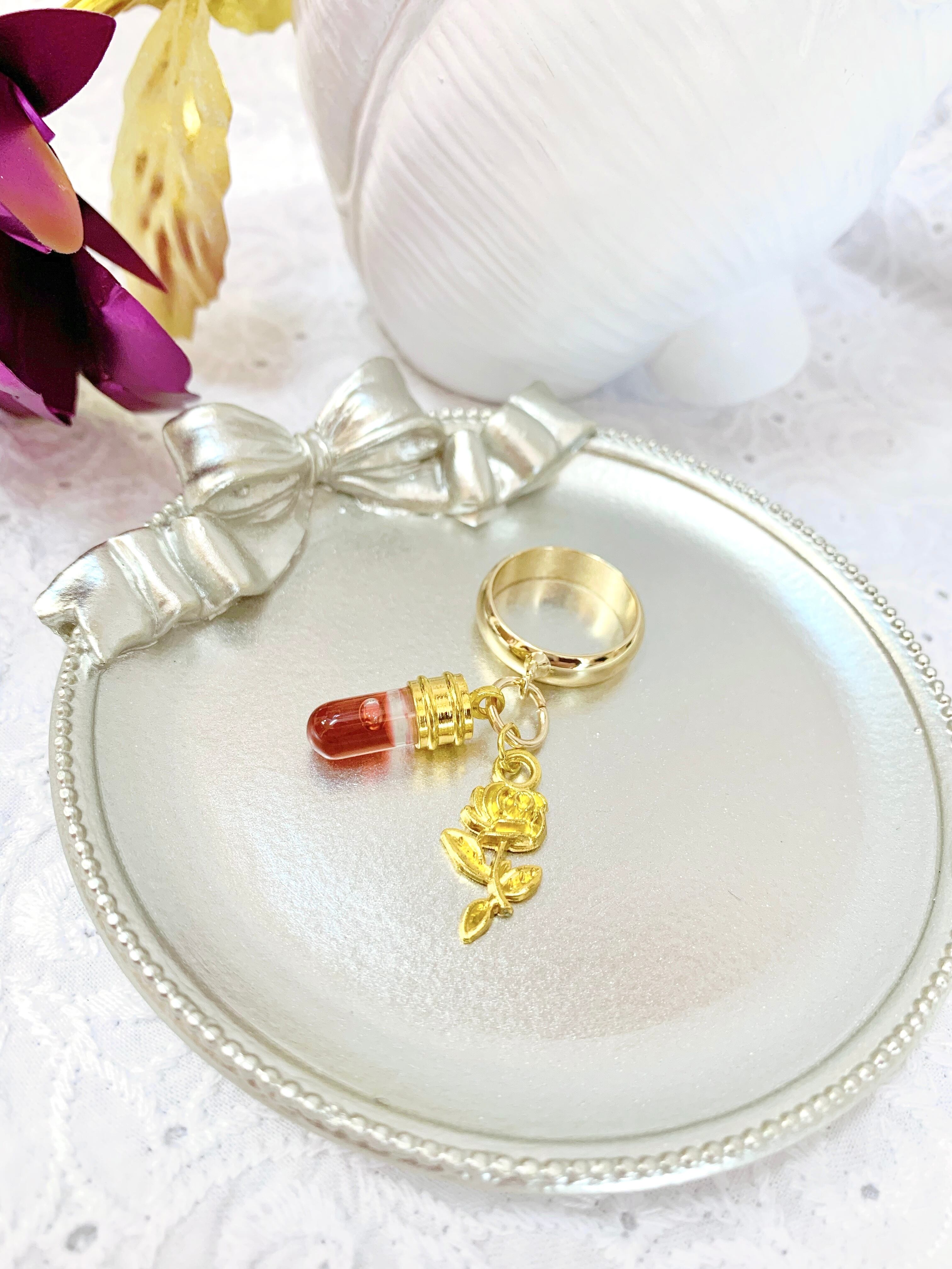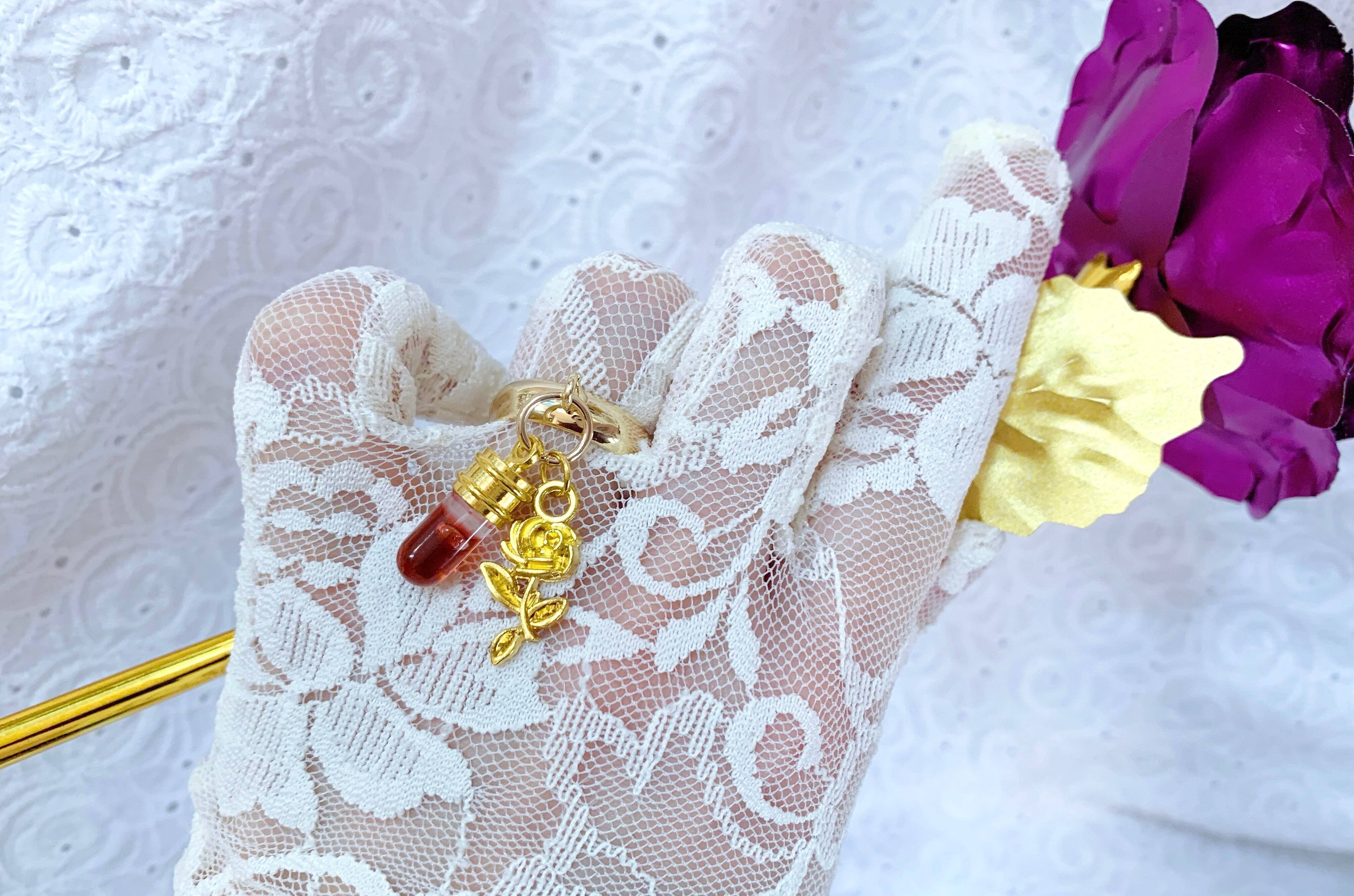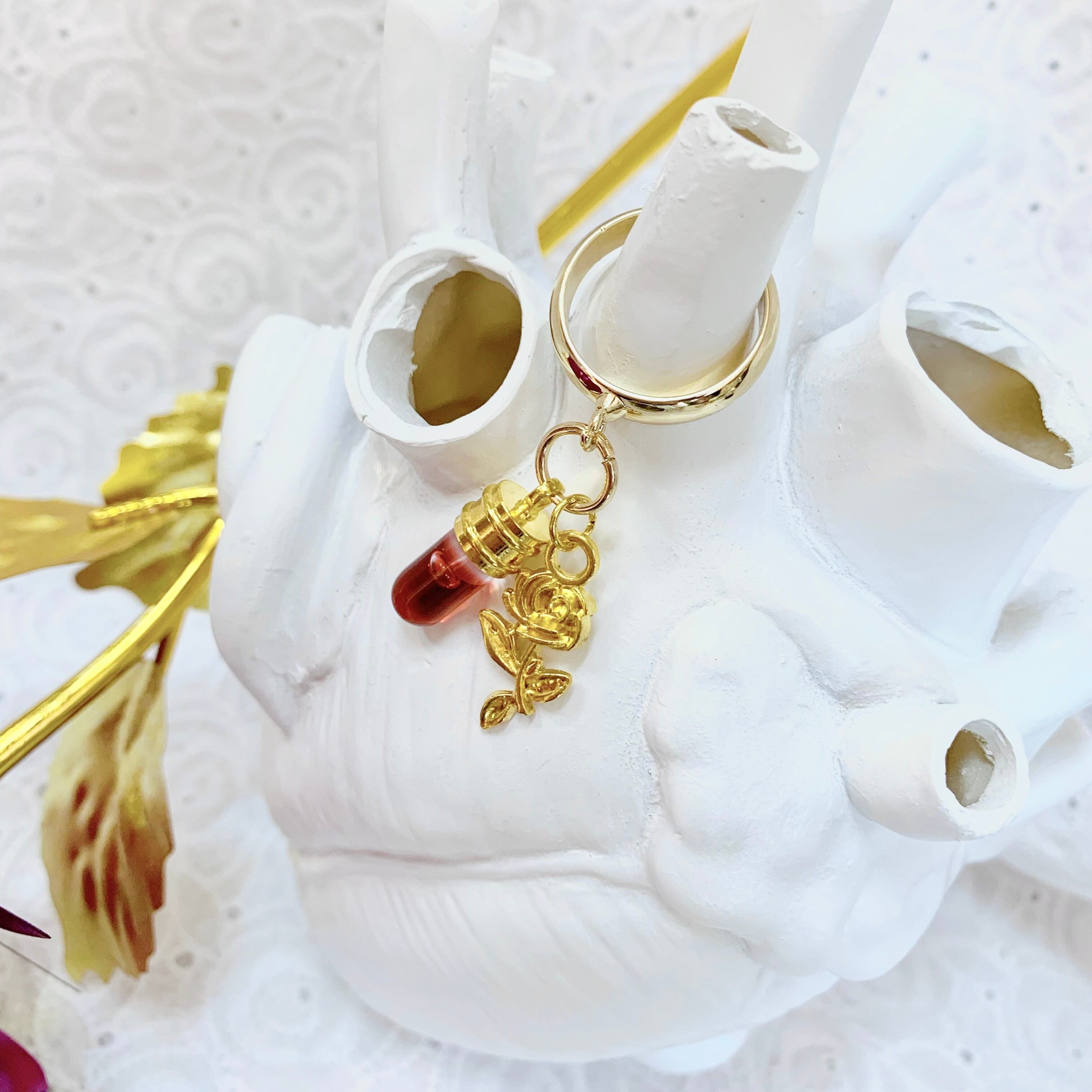 小さな試験管の中には、赤黒い液体。そして棺に残した花をイメージした薔薇のチャームが妖しく揺れます。