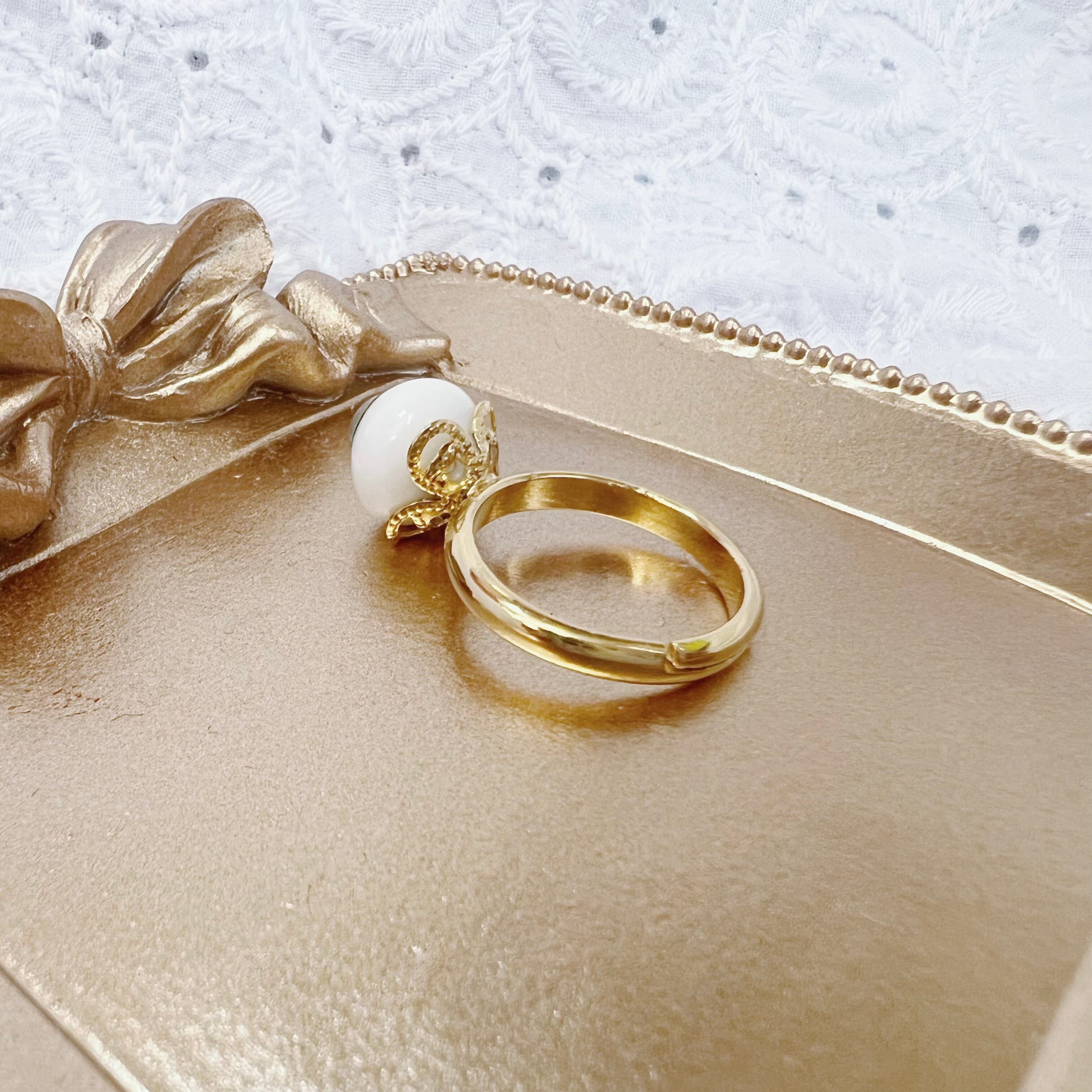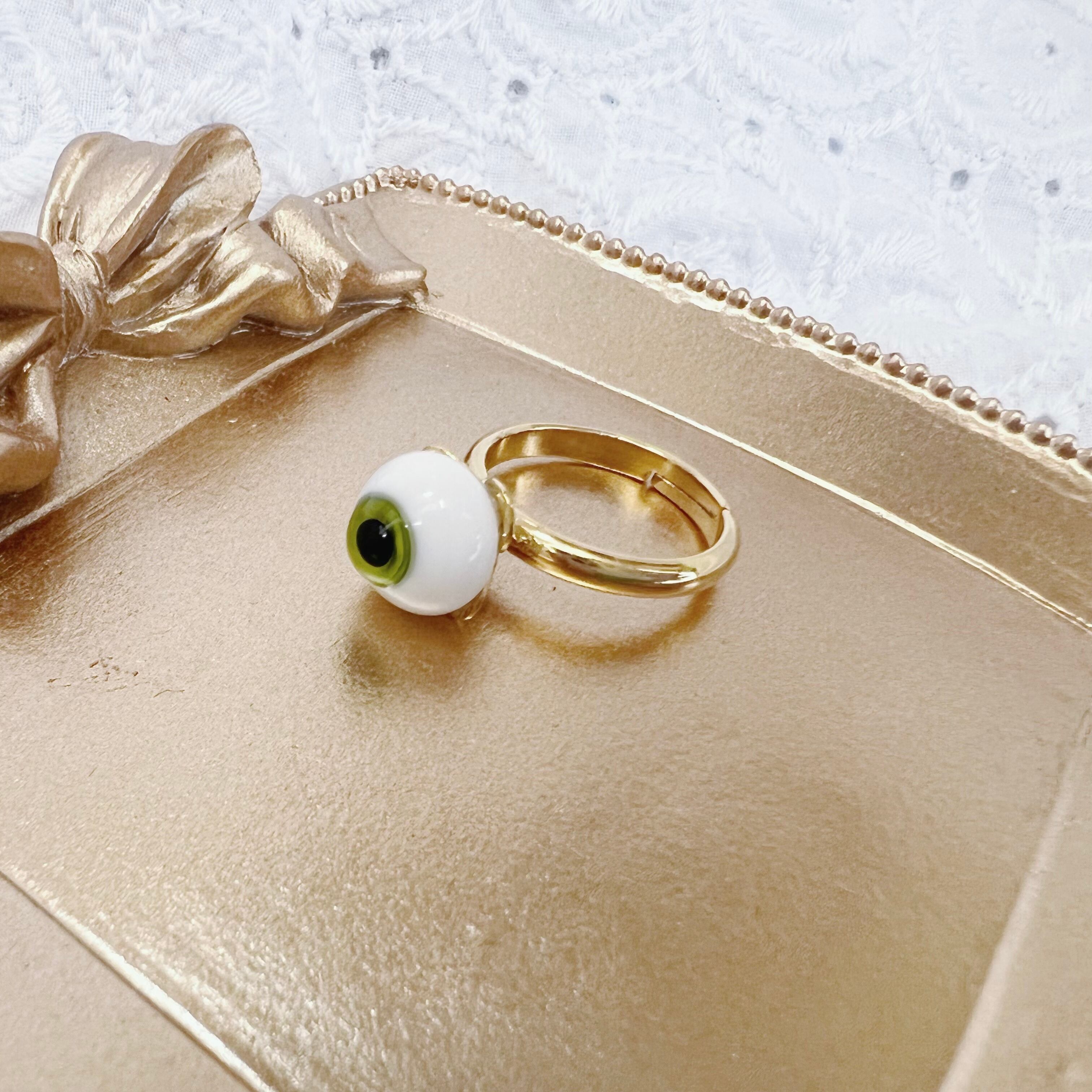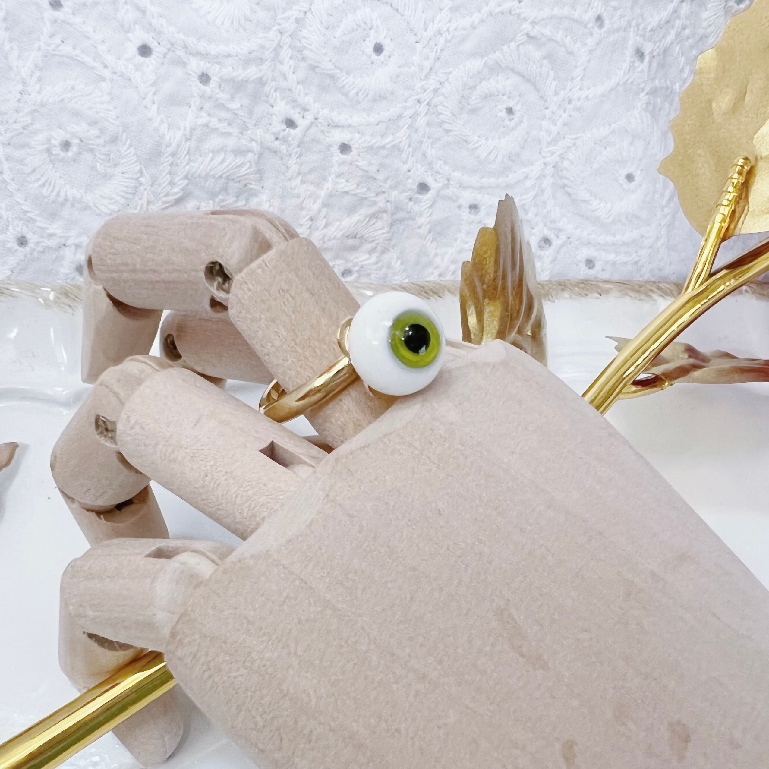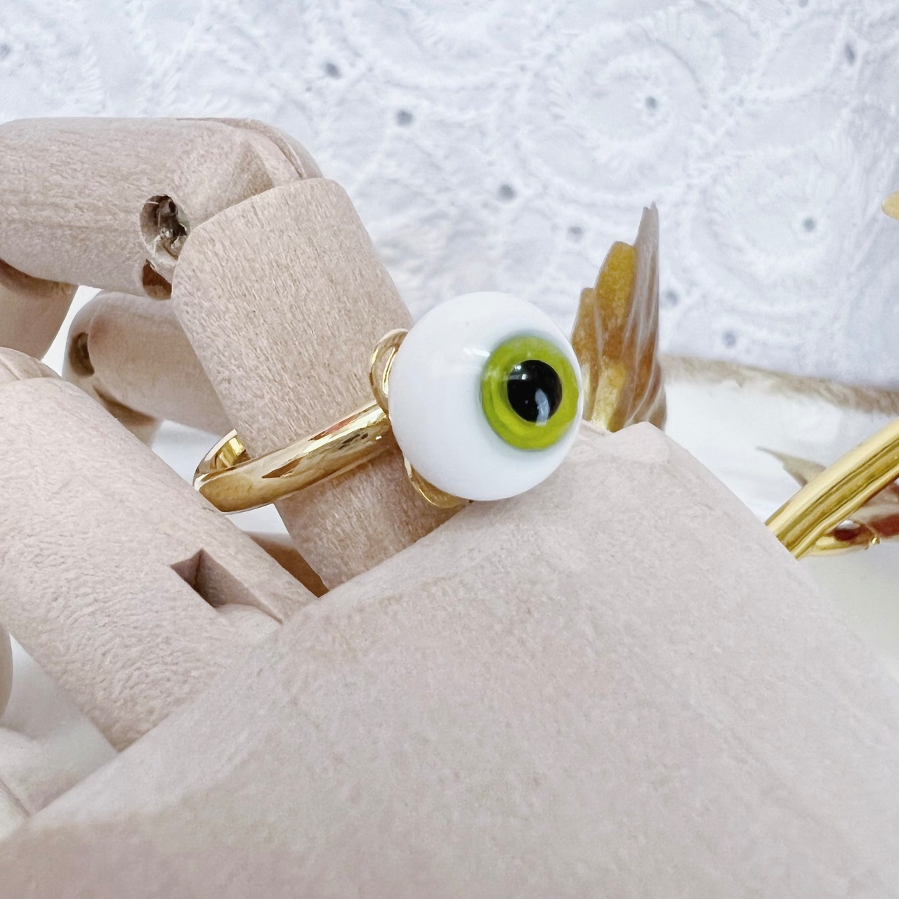 手元でいつでも目の合うリング。優しい若葉色のちいさなグラスアイを、花弁のようなセッティング台に合わせました。小ぶりで上品なリングです。
